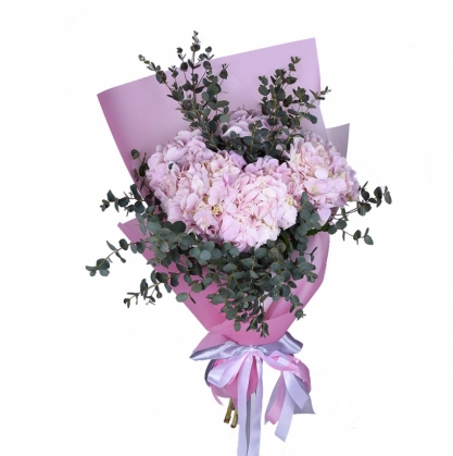 Прекрасный букет из гортензий в стильной матовой бумаге с добавлением эвкалипта